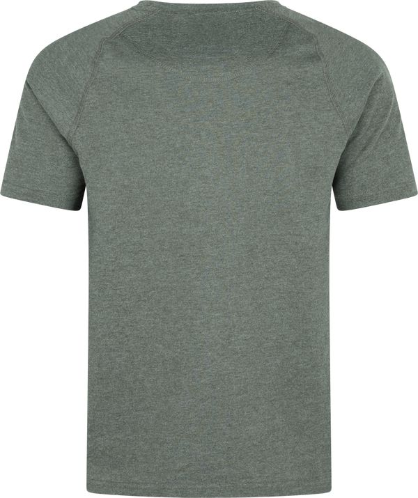 Härkila Identity S/S T-shirt i Green Melange er en kortærmet herre T-shirt til jagt, outdoor og fritid. Den er lavet i en blød og slidstærk 170 g/m² børstet single jersey, som giver en behagelig fornemmelse mod huden og ekstra komfort i hverdagen.Materialeblandingen af bomuld og polyester kombinerer komfort og holdbarhed, så T-shirten egner sig både til aktiv udendørs brug og afslappet hverdagsbrug. Den børstede overflade giver en let varme og et mere eksklusivt look, hvilket gør den velegnet både alene og som lag-på-lag på køligere dage.T-shirten har rund halsudskæring, raglanærmer for god be