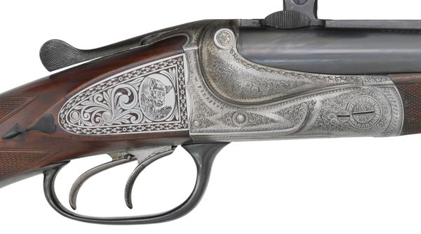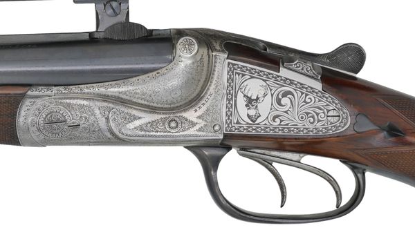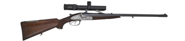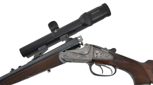 Brugt H. Barella suhl dobbeltriffel i god stand. Med Swarovski Habicht 1,25-4x24 sigtekikkert i einhack. Med kolbe magasin.