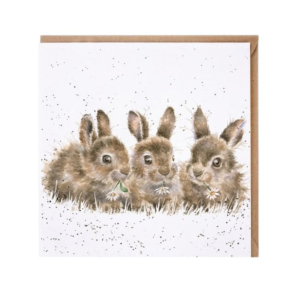 Med tre kunstnerisk afbildede kaniner, der nipper til margueritter, er dette kort perfekt til enhver anledning. Billedet er trykt på højkvalitets, bæredygtigt fremskaffet struktureret papir, og indersiden er blank, så du kan skrive din egen besked. Kortet leveres med en genbrugspapir-kuvert og måler 150 mm x 150 mm.